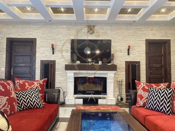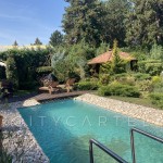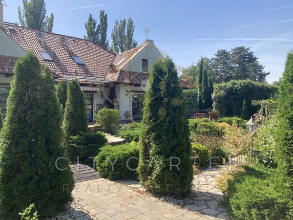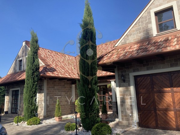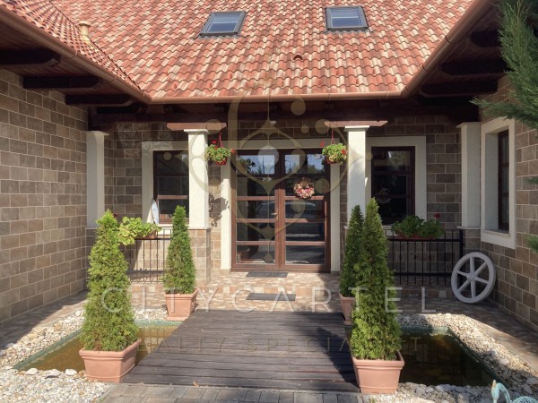 A különleges építészeti megoldásokkal kivitelezett 500 m2-es családi ház egy 2350 m2 méretű telken épült, mely  gyönyörűen parkosított. A kertben megtalálható medence, több kerti tó, játszótér, sportpálya, több beállásos garázs és udvari tárolóként funkcionáló kisház is.